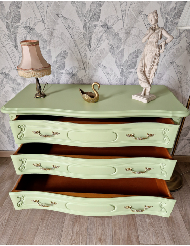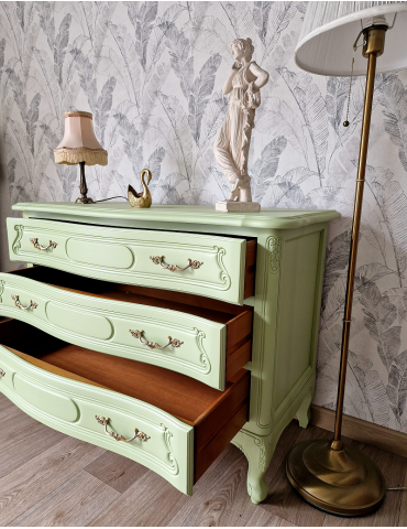 Une belle commode galbée à 3 tiroirs. Une sublime couleur joyeuse qui va à merveille avec les poignées dorées. Un style chic et élégant. Grâce à ce meuble, le printemps s'invitera chez vous en vous offrant une ambiance rayonnante