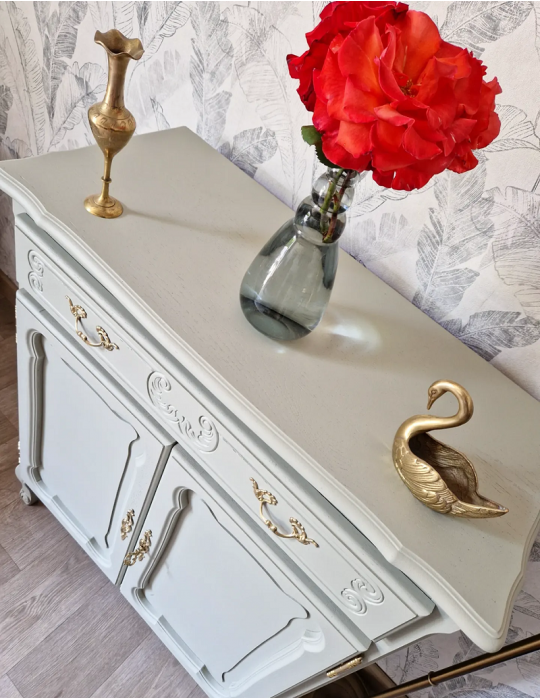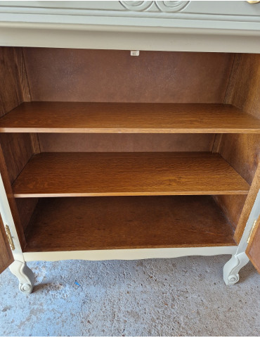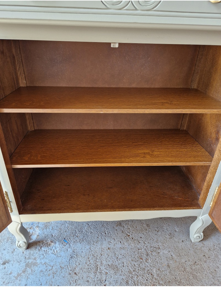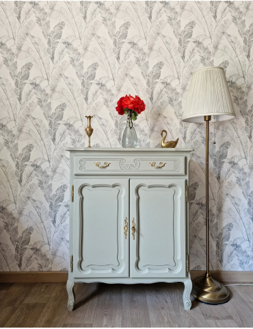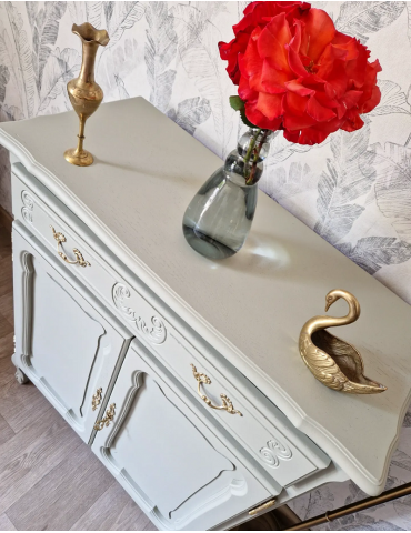 Un très beau meuble d'entrée de couleur verte avec des nuances grises. Des poignées dorées pour plus de charme. Très pratique grâce à ses nombreux rangements. Il pourra servir comme meuble de chaussures