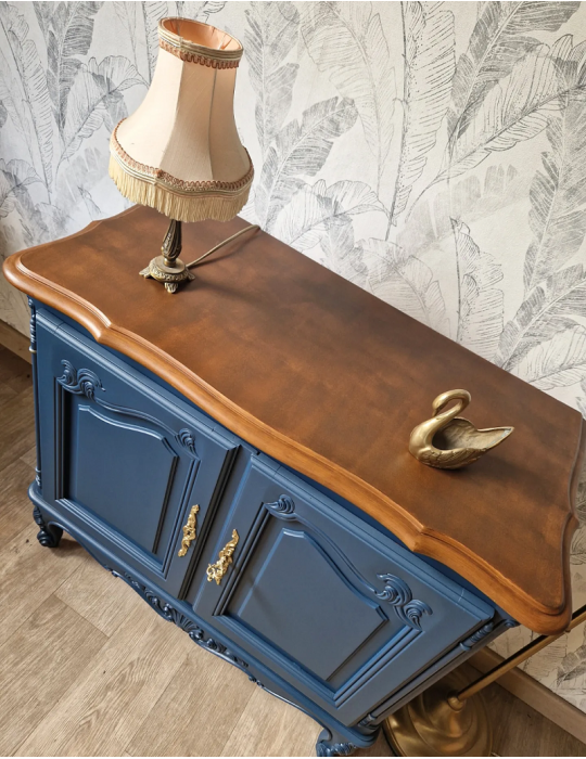 Un très beau de rangement customisé. Une sublime couleur bleu qui se marie à merveille avec le plateau en bois vernis. Très pratique pour les petits espaces. Dans un esprit vintage, il pourra servir de meuble de chaussures, meuble d'entrée...