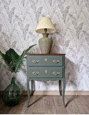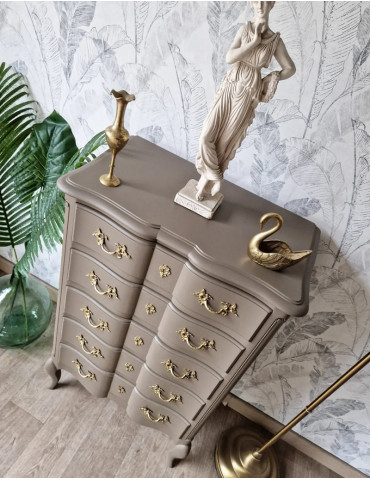 Un beau chiffonnier galbé à 5 tiroirs. Une sublime couleur taupe qui s'associe à merveille avec les poignées dorées. Un meuble vintage chic qui rajoute une touche vintage à votre intérieur