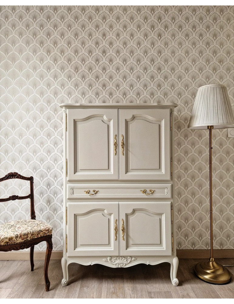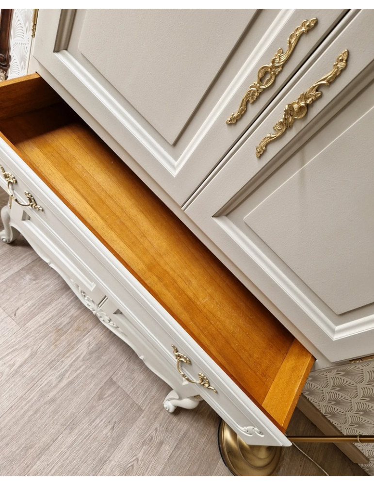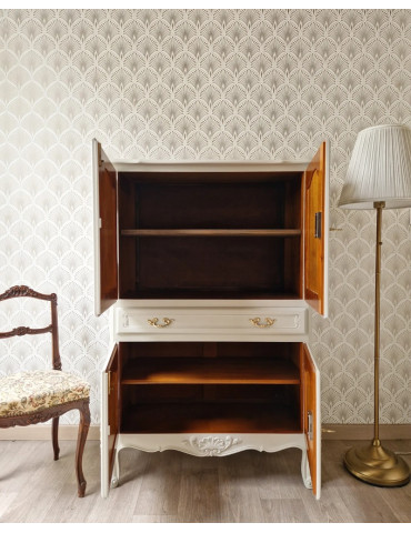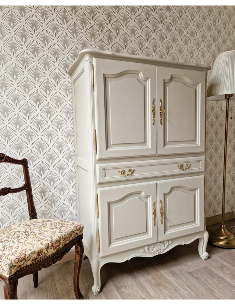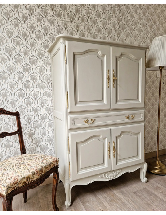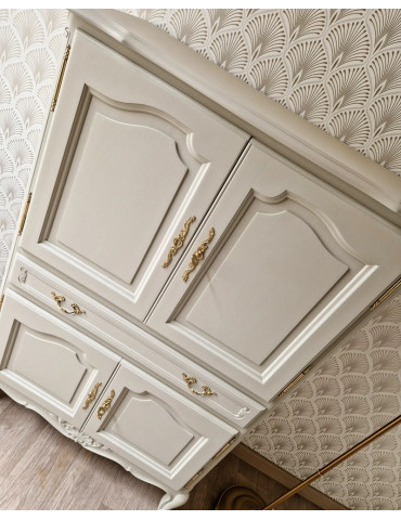Une sublime armoire vintage typiquement le style français. Une sublime couleur blanc champagne qui s'accorde parfaitement avec les formes du meuble. En plus de son charme, ce meuble est très pratique grâce à ses nombreux rangements