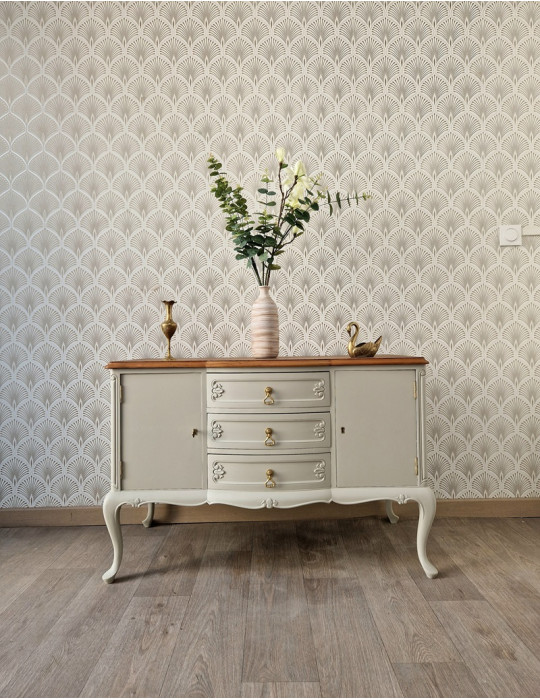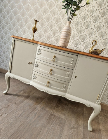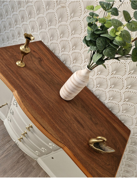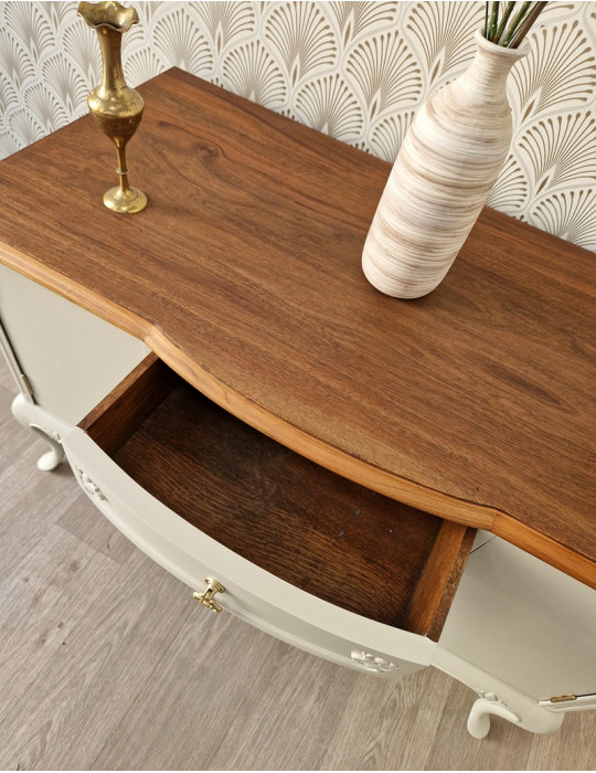 Un magnifique meuble d'entrée vintage de couleur blanc champagne. Un plateau en bois vernis qui s'associe parfaitement avec la teinte du meuble. très élégant, ce meuble pourra servir de meuble télé
