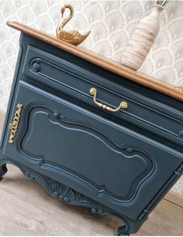 Un petit meuble de rangement de couleur bleue avec un plateau en bois. Très pratique dans les petits espaces grâce à sa taille parfaite. Ce meuble pourra être placé dans une entrée ou dans une chambre