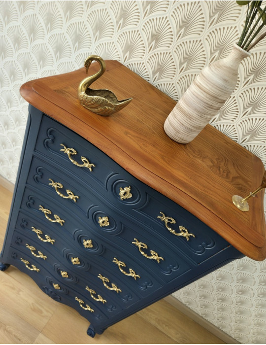 Un sublime chiffonnier à six tiroirs. Une sublime couleur bleu avec un plateau en bois. Très élégant grâce à sa forme galbée, ce meuble sublimera votre intérieur