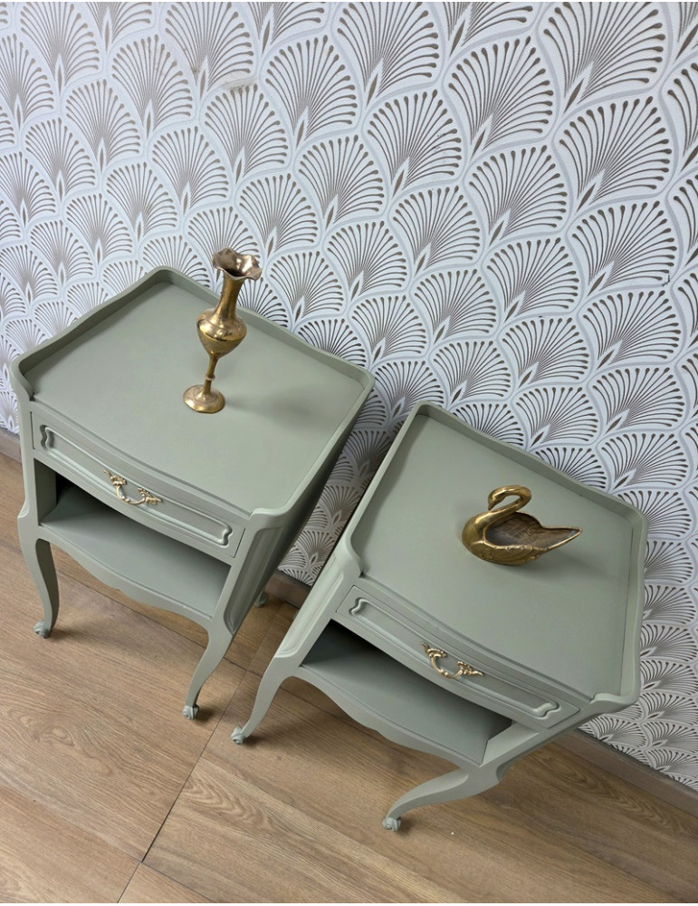 Une belle paire de chevets de style Louis XV. Une sublime couleur verte qui égaiera votre chambre. Equipée d'un tiroir et d'une niche, ces paires vous permettront de ranger vos petits objets