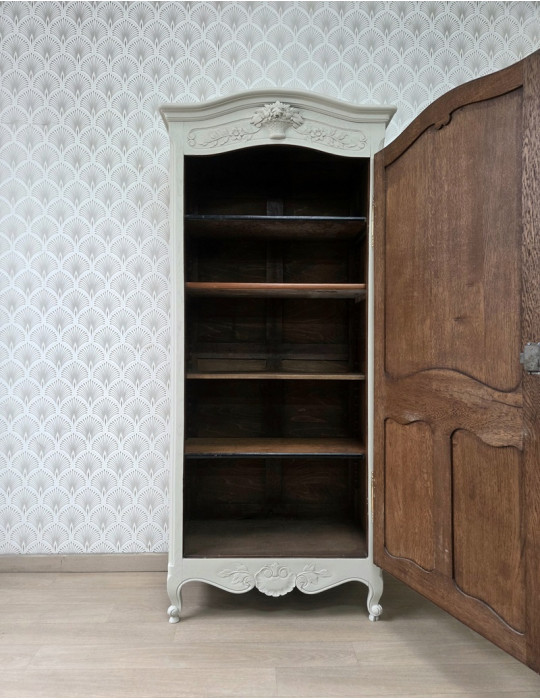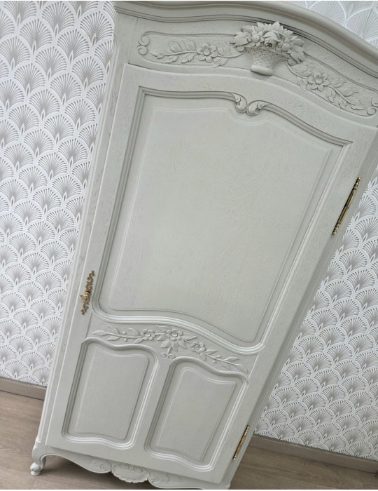 Une sublime bonnetière vintage de couleur blanc cassé. Une belle couleur qui met en valeur les magnifiques moulures et rosaces. Cette armoire lingère en chêne massif est équipée de quatre étagères. Grâce à ce meuble, vous sublimez votre chambre