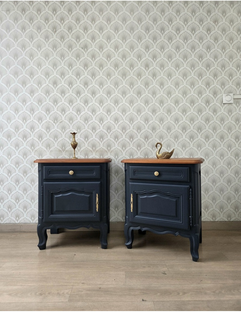 Une belle paire de chevets de couleur bleu nuit avec un plateau en bois vernis. Chaque table comporte un tiroir et une niche qui ferme avec une porte. Mise à part son élégance, ces meubles vous offrent des espaces pour ranger vos petits objets