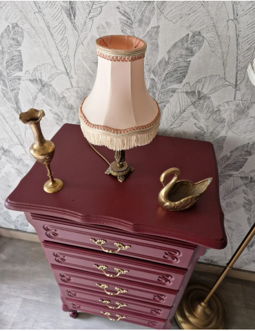 Un beau chiffonnier de couleur rouge baroque. Un rouge bordeaux qui change de nuances en fonction de la luminosité de votre intérieur. Très pratique grâce à ses cinq tiroirs. il pourra servir d'un meuble d'entrée ou bien un meuble de salon. Il changera votre intérieur grâce à son style chic et antique.