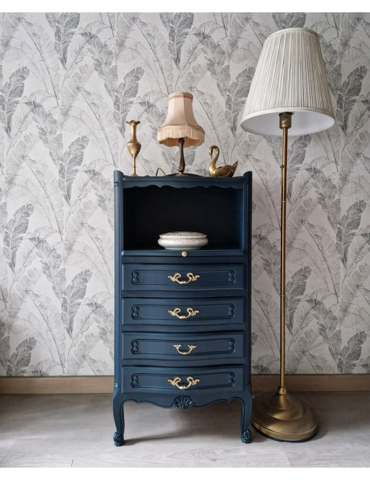 Un très beau meuble d'entrée style vintage. De couleur bleu vert et des poignées dorées. Très pratique grâce à ses 4 tiroirs de rangement et sa niche pour poser des objets de décoration un peu volumineux.
