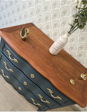 Une sublime commode galbée de couleur avec des nuances grises. Un plateau en bois vernis qui s'associe à merveille avec le meuble. Des fines moulures et des poignées qui donnent beaucoup de charme à cette commode