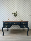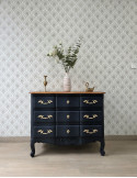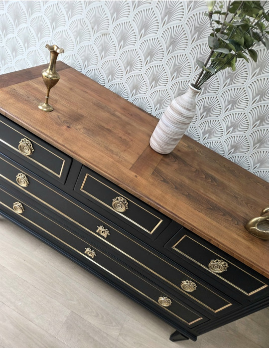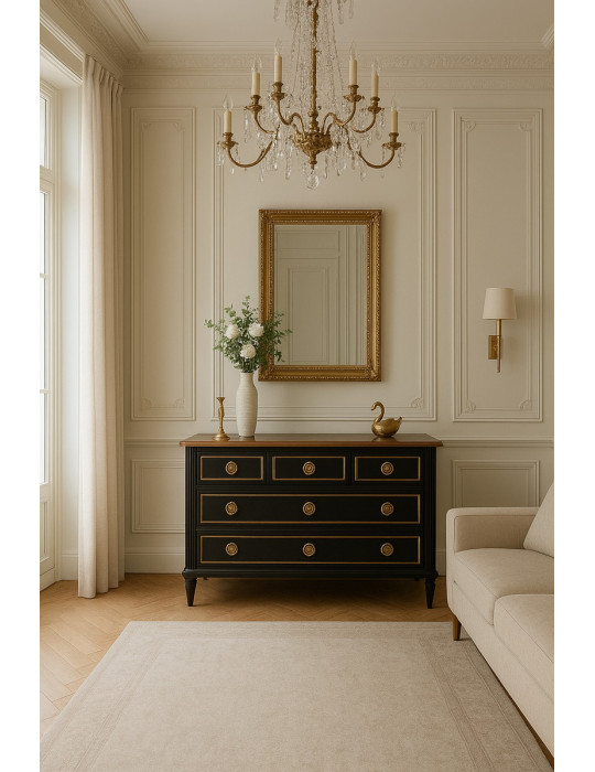 Une sublime commode de style Louis XVI. De couleur noire avec un plateau en bois vernis. Des poignées et des baguettes en laiton viennent contournées les 5 tiroirs. Beaucoup de charme pour ce meuble chic qui sublimera votre intérieur