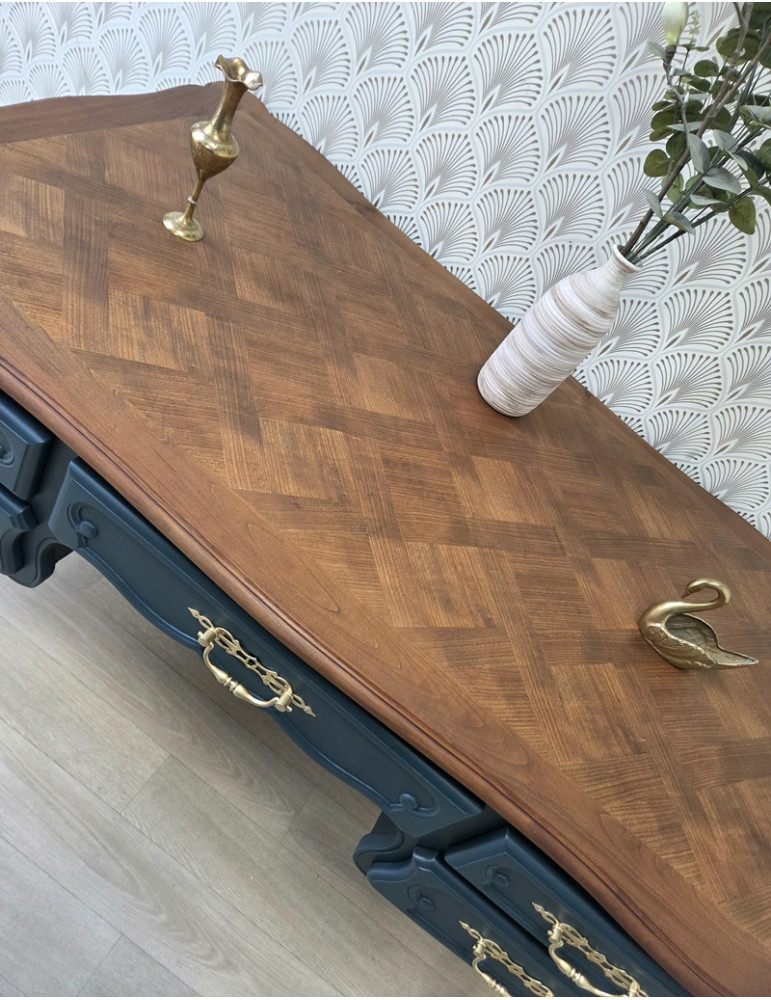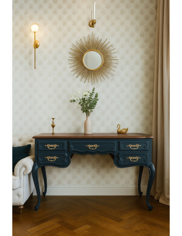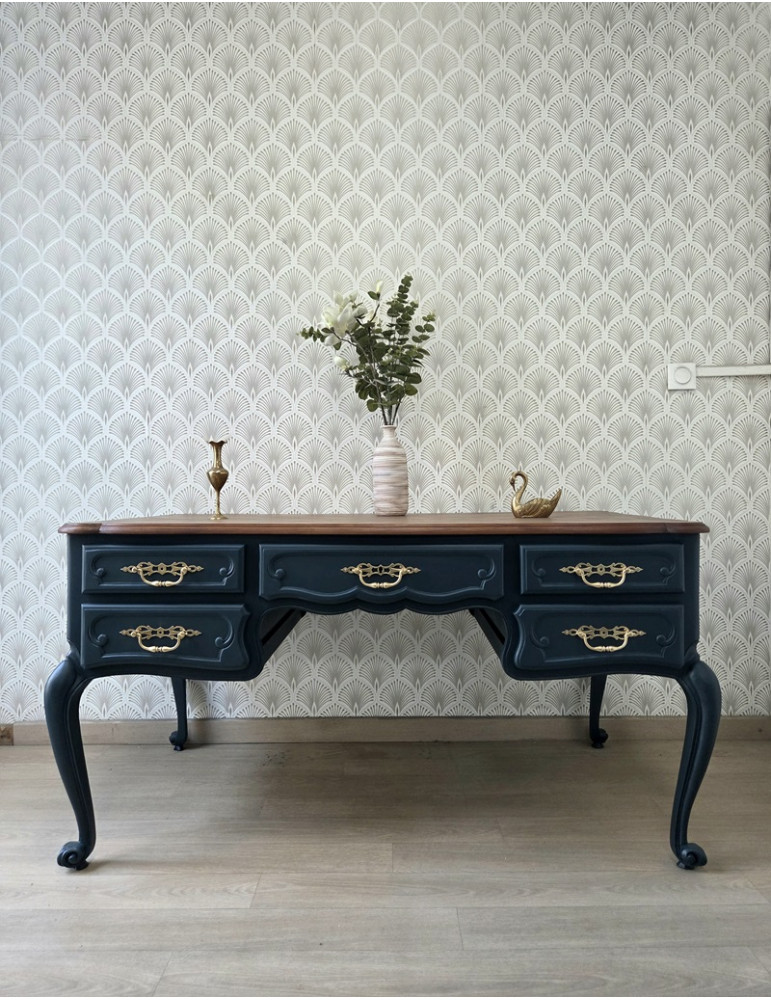 Un sublime bureau de style Louis XV. Une belle couleur bleue avec un plateau en bois vernis avec des motifs de parquet de Versailles. la façade avant ouvrant par cinq tiroirs. Cette pièce unique, allie charme et élégance, sublimera votre intérieur.