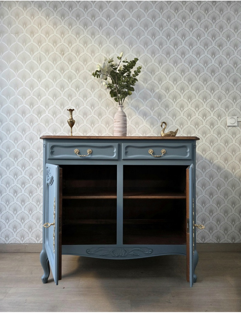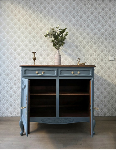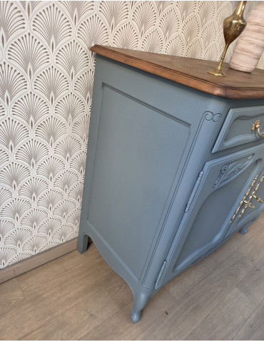 Un sublime buffet de style Louis XV. Une belle couleur bleu-gris qui s'associe à merveille avec son plateau en bois. La façade avant ouvrant par 2 tiroirs et 2 grandes portes. Très élégant et pratique en même temps, ce meuble sublimera votre intérieur et vous offrira un grand espace de rangement.