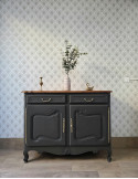 Cette vitrine en bois massif type merisier est une fabrication française datant des années 70-80. Elle a été restaurée et remise au goût du jour au sein de notre atelier d'une manière artisanale et soignée. Afin de retrouver la structure d'origine, ce meuble a été entièrement nettoyé et poncé. A l'aide d'un pistolet de peinture de haut de gamme, nous avons appliqué une sous couche pour bloquer les remontés tanins du bois et nous avons appliqué une peinture écologique en deux couches. C'est une peinture très résistante de finition mat, à base d'eau et sans COV. Pour conserver l'âme du meuble, nous avons gardé les poignées et les accessoires d'origine qui ont été nettoyées et redorées