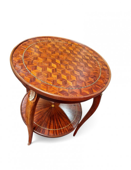 Un sublime guéridon à deux plateaux en marqueterie. Le plateau du haut est en marqueterie losange. Ce meuble a été entièrement restauré au sein de notre atelier