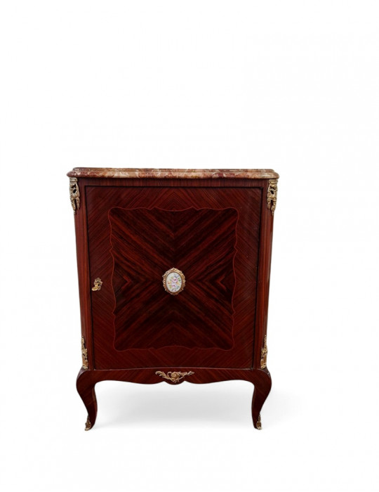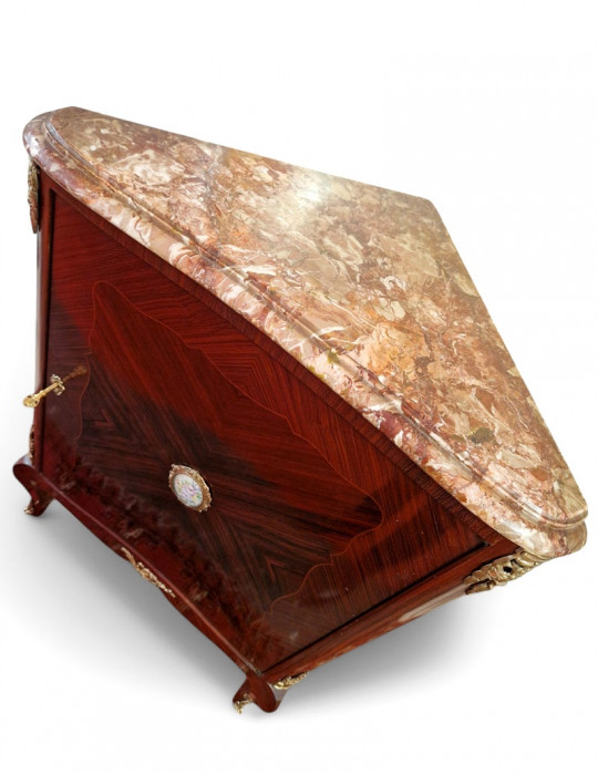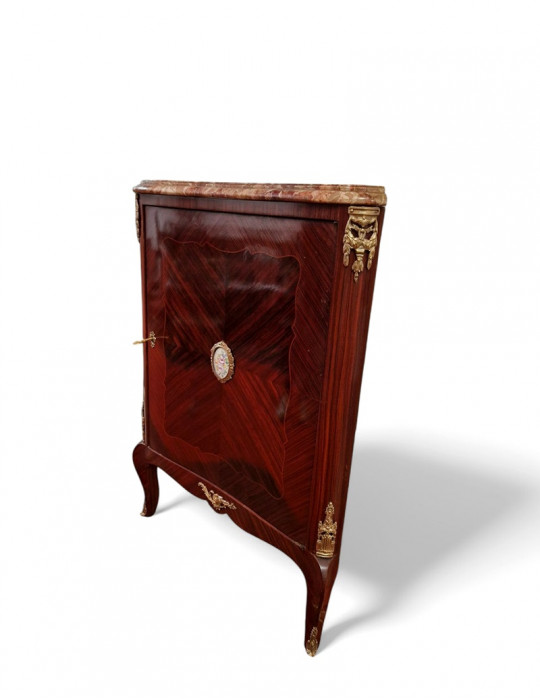 Une belle encoignure à façade plate ouvrant par une porte à façade plate et laissant découvrir une étagère intérieure. Plateau en marbre rouge. Ornements et serrure en bronze dorés